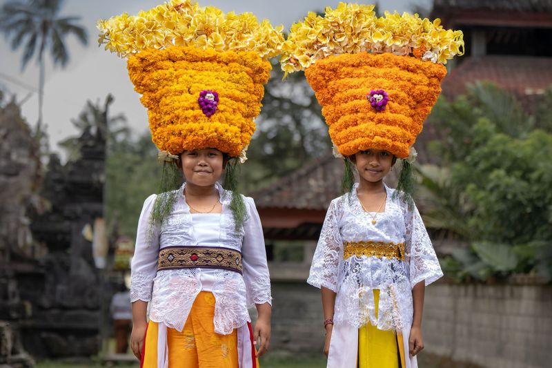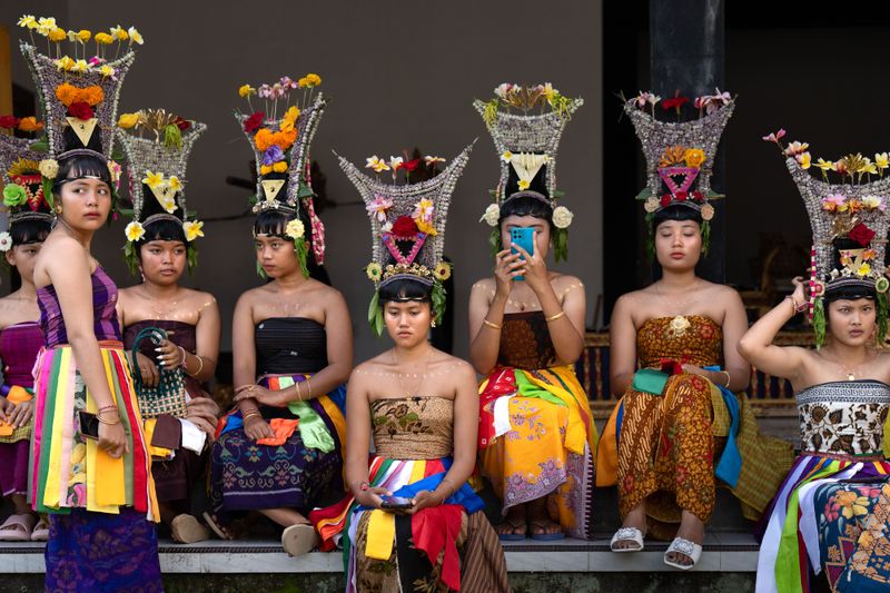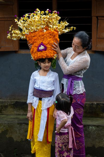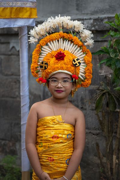 Hiasan kepala Rejang adalah elemen yang paling memikat mata: rangkaian janur, gumitir, kenanga, daun hijau segar, hingga butiran bunga dan perhiasan yang tersusun rapi. Semuanya bukan sekadar estetika, tetapi bahasa simbolis tentang keindahan, kesucian, dan identitas budaya.